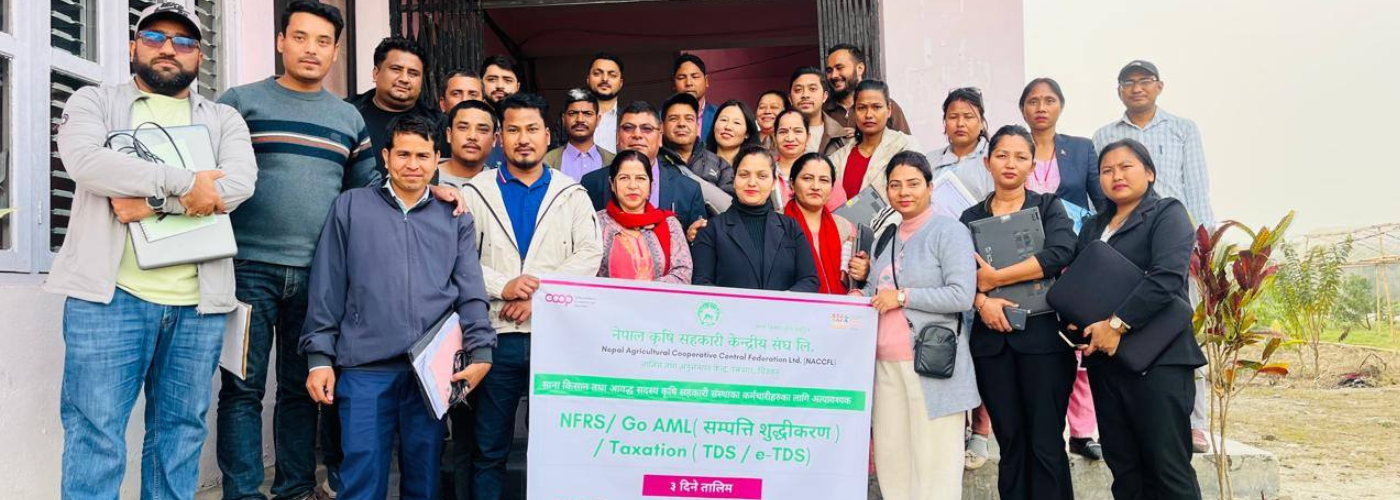 Lalitpur, Falgun 13, 2081 – The NACCFL Training and Research Center of the Nepal Agriculture Cooperative Central Federation Ltd. (NACCFL) has successfully completed two batches of training on Nepal Financial Reporting Standards (NFRS), goAML, Tax Deducted at Source (TDS), and e-TDS for its member cooperatives. The two training sessions were conducted on Falgun 7, 8, and 9, and Falgun 10, 11, and 12, 2081, respectively.